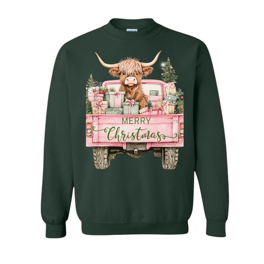 Highland Cow Pink Truck Christmas Crewneck • PRE ORDER •