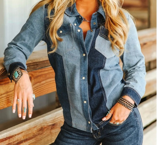 Denim Patchwork Pearl Snap Top